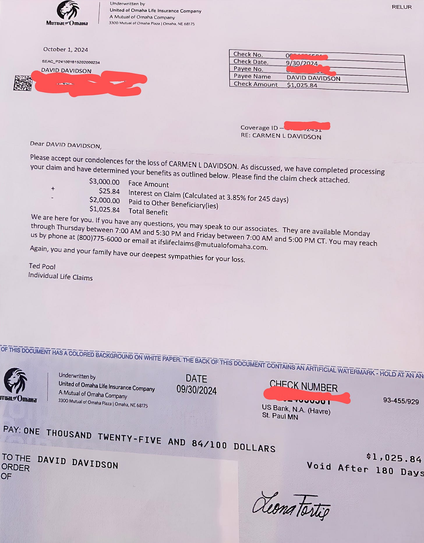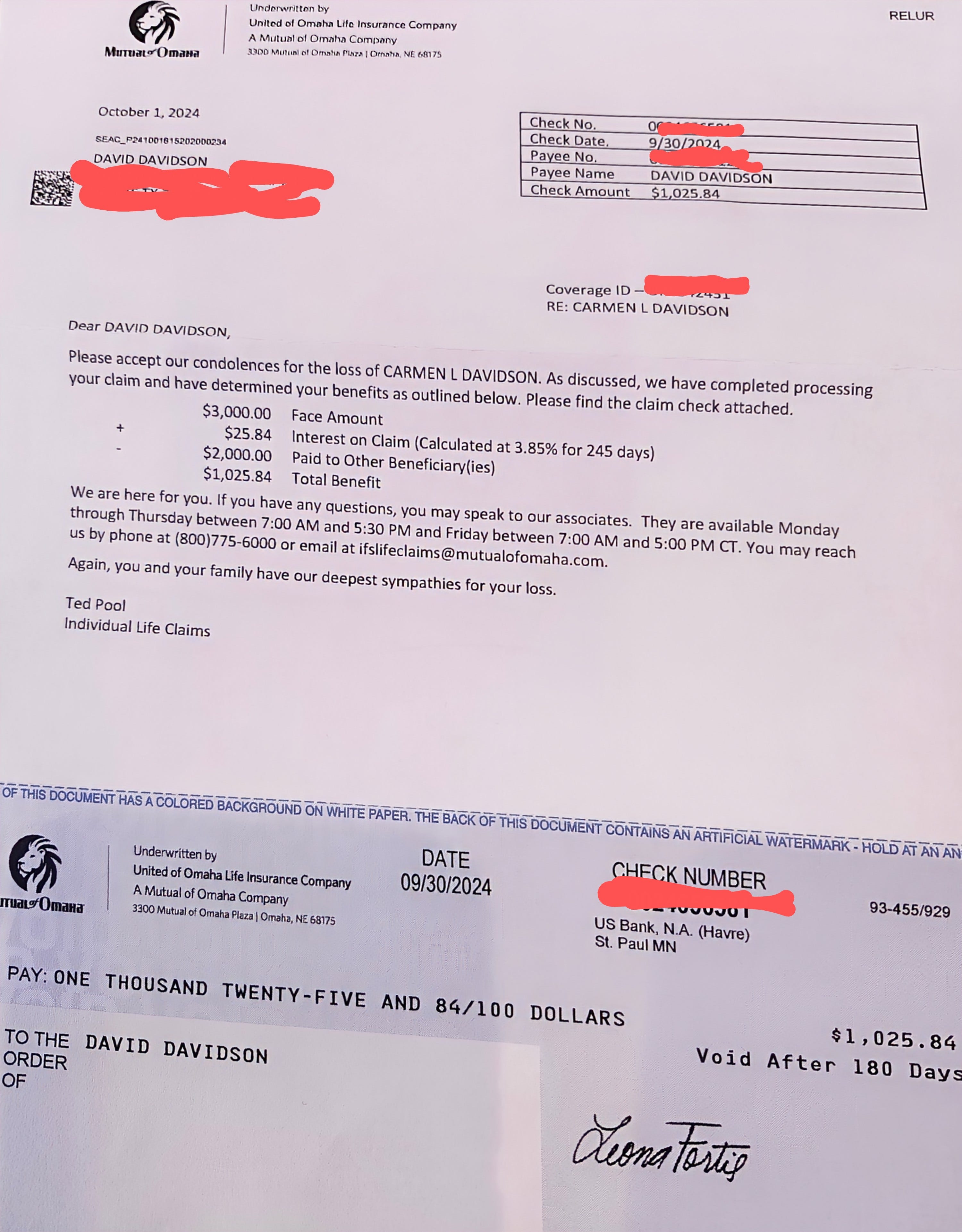 Mom was in no hurry to die though! She wanted to live. With absolutely everything in her she wanted to live! Yes, she missed Dad, profoundly and profusely missed Dad, but NO she was in no hurry to die, but in the grand scheme of things shouldn’t a person want more, much more, for the members of their family than a little over $1k USD each? Really? Seriously? Like can you afford it Mutual of Omaha and Company? Its a lot I know, it may put the shareholders and powerbrokers of your company at great financial risk if you add another few ones on the front end, huh? The trees alone that were sacrificed for formal letters/packages, phone calls, voicemails, etc. etc., I guess, had to be paid, sure, and then there’s the whole, "death and taxes" thing. So there is that!